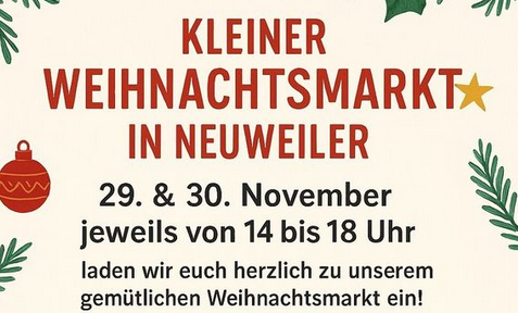 Ein kleiner Weihnachtsmarkt, mit handgemachten Dekorationen, Aloe-Vera-Produkten und kleinen Weihnachtsgeschenken. Kommt vorbei, auf Glühwein und Kinderpunsch.
