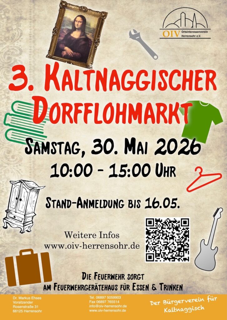 Der Ortsinteressenverein Herrensohr lädt herzlich zum 3. Kaltnaggischer Dorfflohmarkt in Saarbrücken-Herrensohr ein. Am Samstag, 30. Mai 2026, von 10 bis 15 Uhr, können Besucherinnen und Besucher über den gesamten Ort verteilt vielseitige Flohmarktstände entdecken.