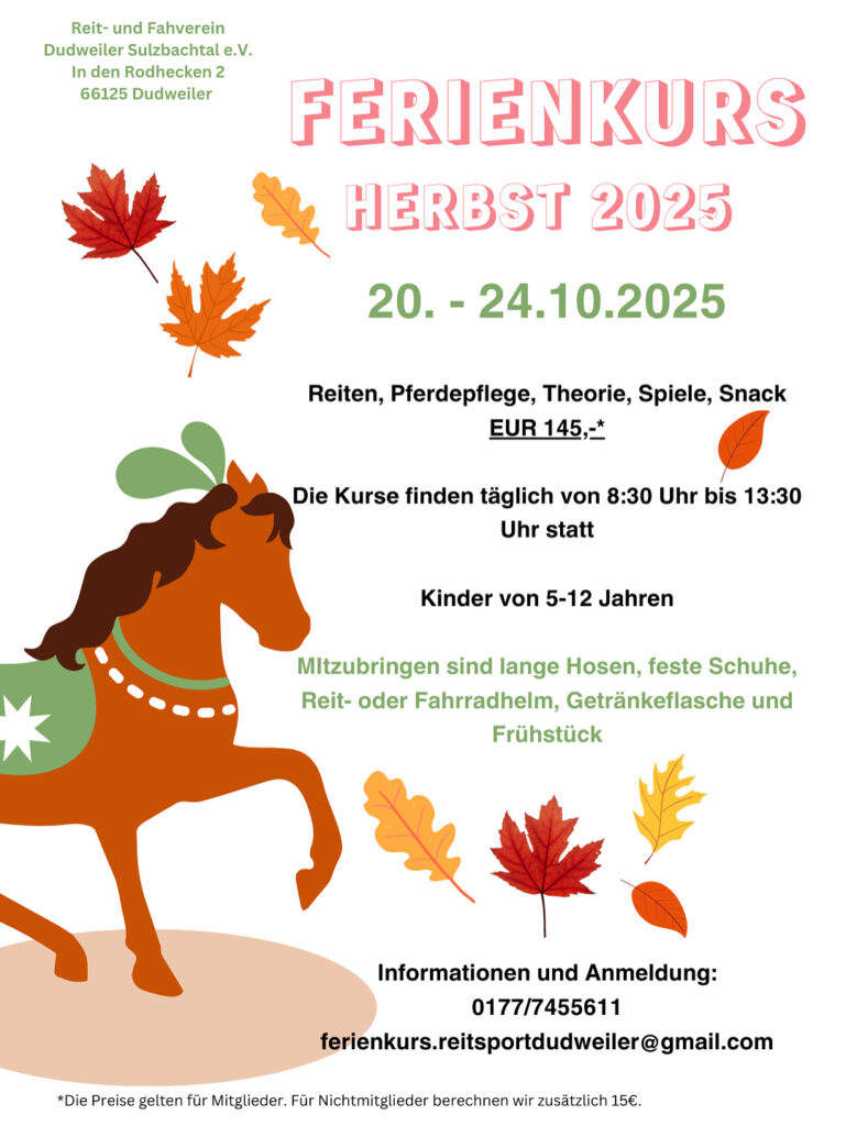 Der Reit- und Fahrverein Dudweiler Sulzbachtal e.V. bietet einen Ferienkurs in den Herbstferien an.