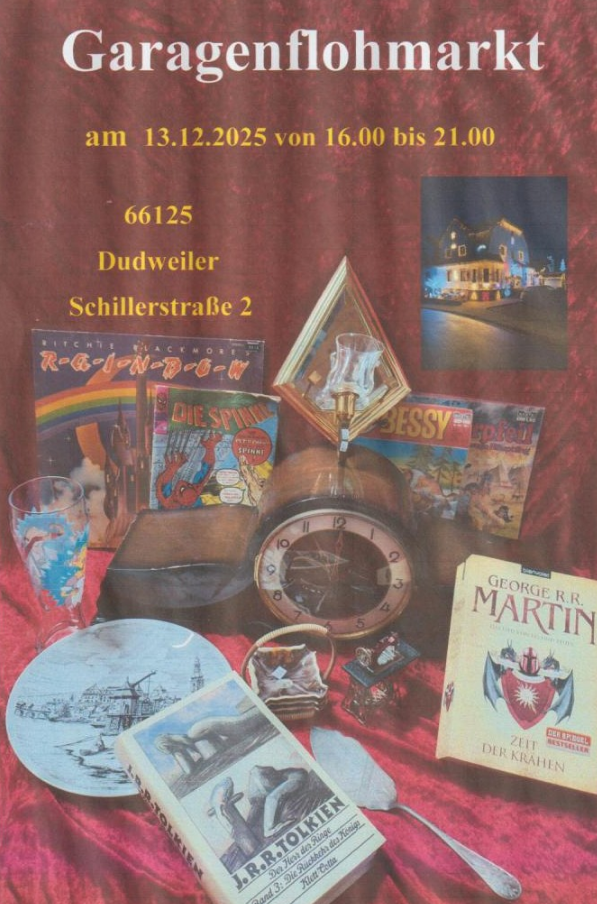 Privater Garagenflohmarkt mit weihnachtlicher Atmoshäre.
