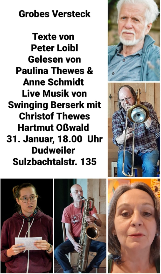 Grobes Versteck. Texte von Peter Loibl, Gelesen von Paulina Thewes & Anne Schmidt. Live-Musik von Swinging Berserk mit Christof Thewes und Hartmut Oßwald.