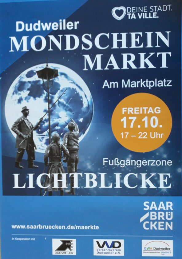Am Freitag, 17. Oktober, 17 bis 22 Uhr, lädt die Landeshauptstadt gemeinsam mit dem Verkehrsverein Dudweiler, ProDorf Dudweiler und der Gemeinwesenarbeit (GWA) Dudweiler zum Mondscheinmarkt auf den Marktplatz in Dudweiler und zur Veranstaltung „Lichtblicke“ in die Fußgängerzone ein.