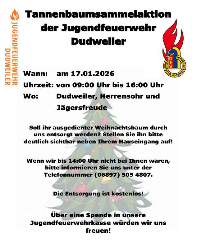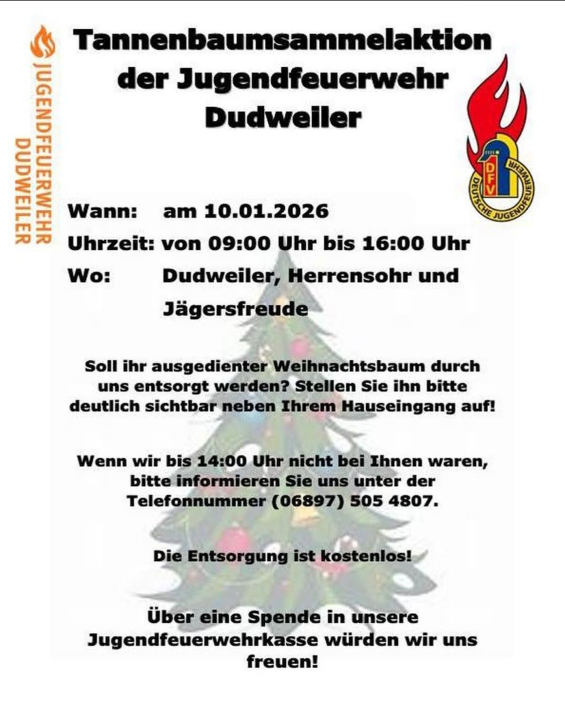 Am Samstag sammelt die Jugendfeuerwehr wieder die Weihnachtsbäume in Dudweiler, Herrensohr und Jägersfreude ein. Die Entsorgung ist kostenlos, aber die Jugendfeuerwehr freut sich natürlich über eine Spende.