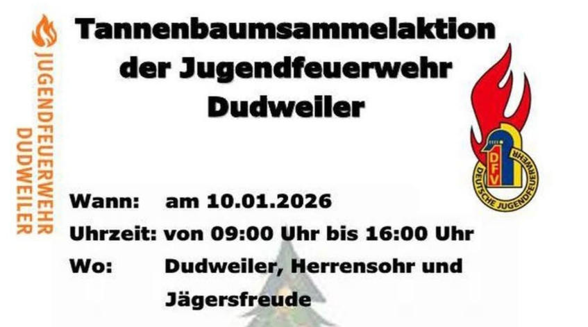 DudweilerAm Samstag sammelt die Jugendfeuerwehr wieder die Weihnachtsbäume in Dudweiler, Herrensohr und Jägersfreude ein. Die Entsorgung ist kostenlos, aber die Jugendfeuerwehr freut sich natürlich über eine Spende. Falls der Baum bis 14 Uhr noch nicht abgeholt wurde, bitte unter 06897 505 4807 melden.